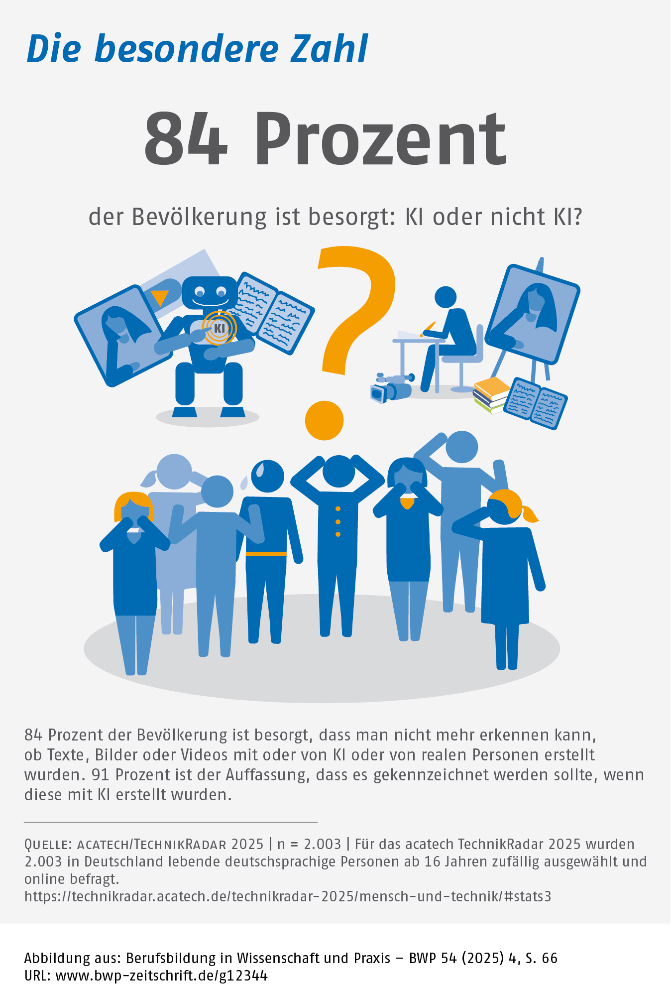 84 Prozent der Bevölkerung ist besorgt, dass man nicht mehr erkennen kann, ob Texte, Bilder oder Videos mit oder von KI oder von realen Personen erstellt wurden. 91 Prozent ist der Auffassung, dass es gekennzeichnet werden sollte, wenn diese mit KI erstellt wurden.