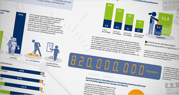 In der betrieblichen Ausbildung sind fast ausschließlich Beschäftigte involviert, die die Ausbildungsleistungen während oder anstelle ihrer eigentlichen Tätigkeit erbringen. Das Poster zeigt, welche Beschäftigtengruppen an der Ausbildung beteiligt sind und wieviel Zeit sie aufwenden.