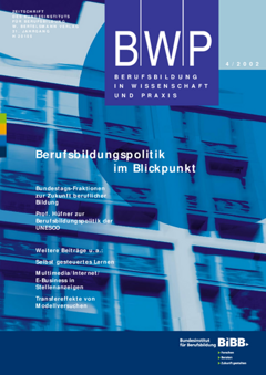 Im Vorfeld der Bundestagswahl 2002 wurden die im Bundestag vertretenen Parteien nach ihren Vorstellungen zur künftigen Politik in der beruflichen Aus- und Weiterbildung befragt. Einig sind sich die Parteien, dass eine zukunftsfähige Berufsausbildung und lebensbegleitendes Weiterlernen eine entscheidende Voraussetzung für die berufliche und persönliche Entwicklung jedes Einzelnen sowie für die Entwicklung des Wirtschaftsstandortes Deutschland sind. Differenzierungen gibt es zwischen den einzelnen Parteien, welche Schwerpunkte und Akzentuierungen gesetzt werden sollen. Gefragt wurde nach den hauptsächlichen Stärken und Schwächen im deutschen System der beruflichen Aus- und Weiterbildung, den Schwerpunkten einer Novellierung des Berufsbildungsgesetzes, der geplanten Stiftung Bildungstest zur Qualitätssicherung und Transparenz in der beruflichen Bildung und den Schwerpunkten in der beruflichen Bildung bei Regierungsverantwortung nach der Bundestagswahl.