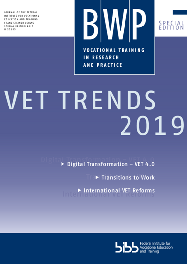 This special edition singles out some of the current subjects to be discussed within the professional community and by the interested public at national, European and international level. The articles address three topics that have become highly pertinent over recent years (Digital Transformation – VET 4.0, Transitions to Work and International VET Reforms). By pointing out these topics and publishing them in English, we hope to give you an insight in trends and progress within the German system of vocational education and training (VET) and to encourage the discussion on many levels.