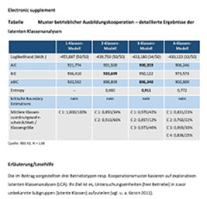 Die im Beitrag in Abb. 2 vorgestellten Muster betrieblicher Ausbildungskooperationen basieren auf einer latenten Klassenanalyse (LCA). In dieser PDF-Datei sind die Kennwerte für die vier geschätzten Modelle.