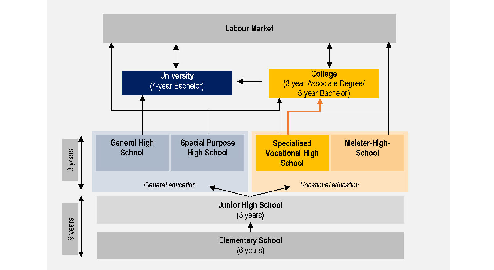 In South Korea, the preference for higher education is traditionally strong, while VET is perceived as a second choice or even a dead end by the population. However, in view of the high level of youth unemployment, government efforts aim to strengthen the quality of VET and thus make VET attractive for young people as well as for employers. In particular, increased cooperation between enterprises and educational institutions should improve the performance of the VET sector.