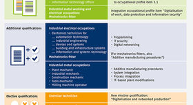 Additional qualifications consist of knowledge and skills that go beyond the standard contents of VET. They are optional and imparted within the scope of company-based training. Codified additional qualifications are integrated into training regulations. Testing takes place via a separate examination which forms part of the final examination. The legal basis for additional qualifications was created by the 2005 reform of the Berufsbildungsgesetz [Vocational Training Act]. Several additional qualifications were introduced in the amended training regulations for the industrial metal working and electrical occupations and the occupation of mechatronics fitter (2018). Each of these is taught over a period of eight weeks. Four new joint additional qualifications have been created for the metal working occupations and three for the electrical occupations. They address major areas of activity that are connected with digitalisation. An additional qualification entitled “Additive manufacturing procedures” has been introduced for the occupation of mechatronics fitter. This has been taken from the metal working occupations and will now join existing electronics technician additional qualifications.