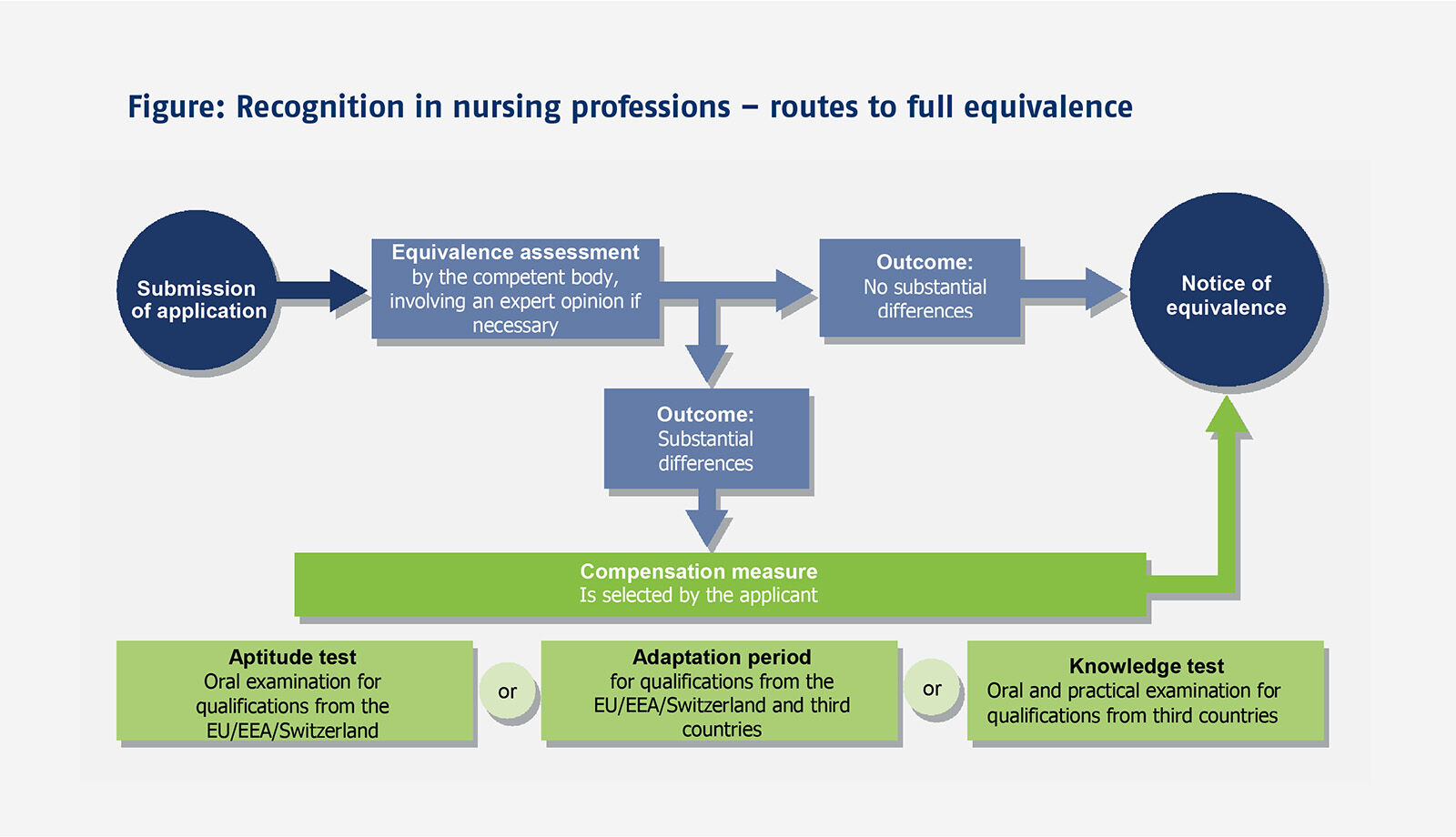 The formal procedural process pursuant to the new Pflegeberufegesetz (PflBG) [Nursing Professions Act] has not significantly altered compared to the separate laws that regulated nursing and geriatric nursing up until 2019. Successful completion of a programme of vocational or higher education training and of a state examination remains the primary prerequisite for authorisation to practise as a nurse. The legal foundations for authorisation to practise are governed by §§ 40 and 41 of the PflBG. These provisions draw a distinction on the one hand between qualifications obtained in a member state of the EU, in a state which is party to the European Economic Area Treaty (EEA) or in Switzerland and on the other hand qualifications that have been acquired in a third country. As the figure shows, the recognition procedure will result in a notice of equivalence being issued as long as no substantial difference to the German reference occupation is identified. The recognition authorities will assign compensation measures if any substantial differences are found. Evidence of knowledge of German, of medical fitness and of reliability are likewise required before authorisation to practise in Germany can be granted. Partial recognition for nurses is not possible.