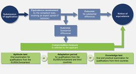 A comparative measure is used in order to ascertain whether and the extent to which an applicant’s qualification is equivalent. Directive 2005/36/EC serves as the basis for the evaluation of qualifications from the EU/EEA/Switzerland. The levels of qualification stated in Article 11 and the minimum requirements stipulated in Article 31 Paragraph 7 a-h of Directive 2005/36/EC (amended by Directive 2013/55/EU) set out conditions for admission (ten years of general school education), the duration of training (4,600 hours) and the distribution and learning venues of practical and theoretical elements of training. Applicants also need to demonstrate possession of the competencies required for carrying out the relevant professional tasks stated in the Directive.