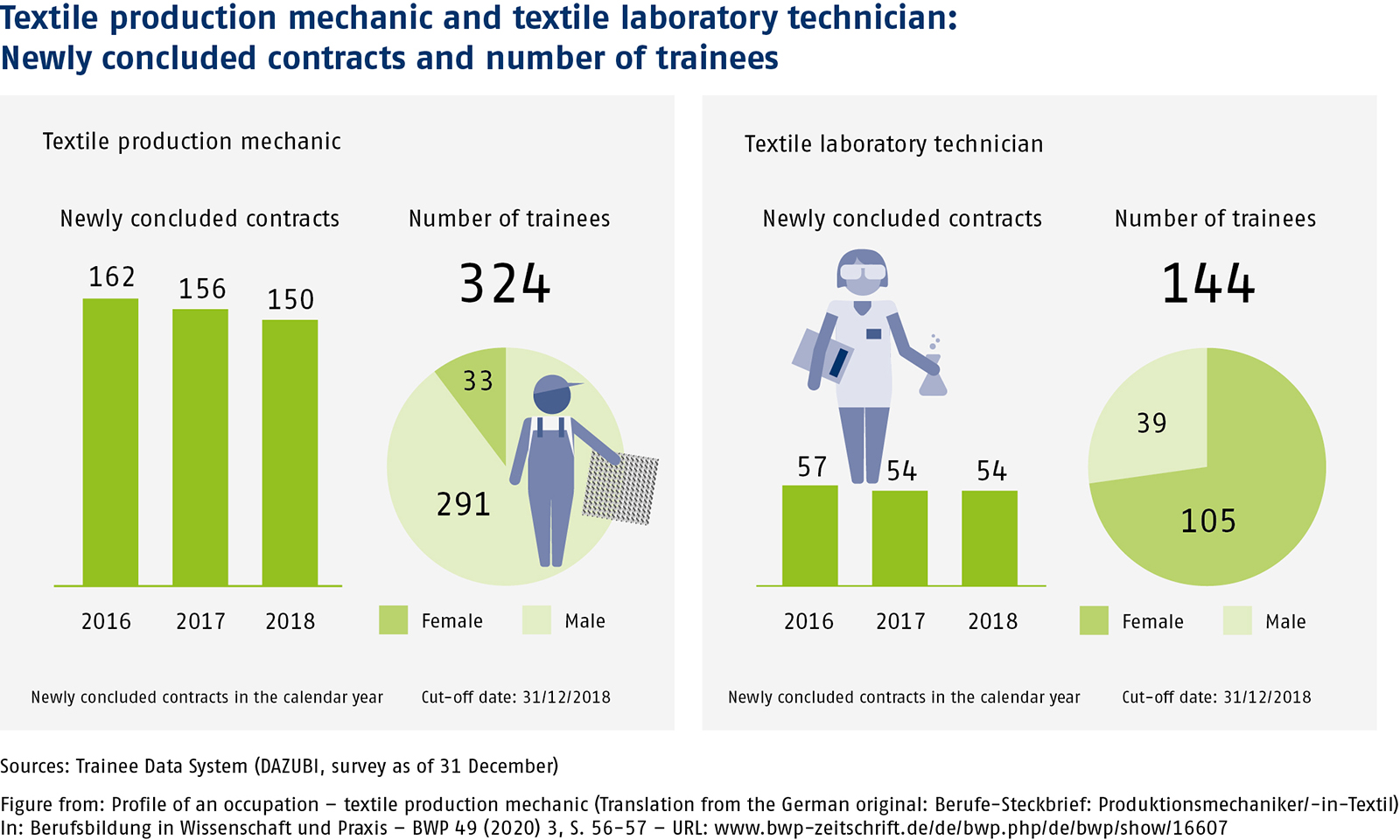 There are also further specialised occupations in the textile industry, such as textile laboratory technician. The job of a textile laboratory technician involves testing fibres, yarns and textile surfaces and the chemicals and auxiliary materials used in the manufacture and finishing of textiles in order to ensure that the materials and supplementary items processed by textile production mechanics are of the very highest quality. Whereas the occupation of textile production mechanic is largely the domain of young men, the proportion of female textile laboratory technicians is significantly higher (cf Figure).