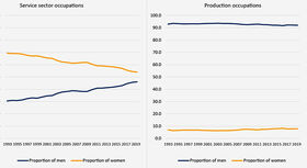Proportion of men in female occupations has risen more sharply over the years than the proportion of women in male occupations