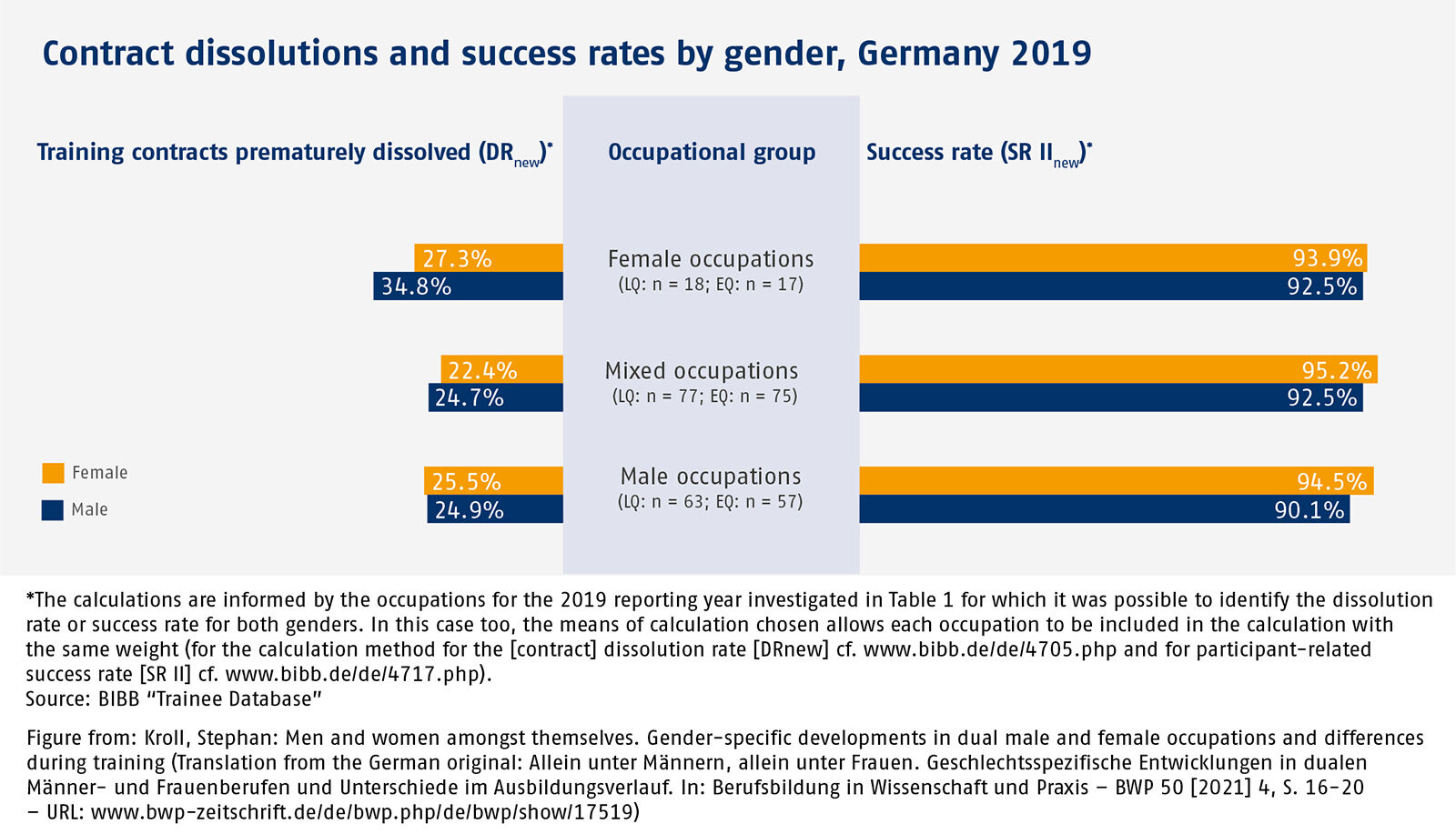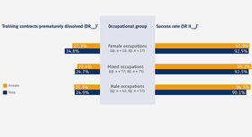 As far as the course of training in overall terms is concerned, it is revealed that women in mixed occupations are the most successful. This occupational group has the lowest dissolution rate and also enjoys the highest success rate – more than 95 percent. While this also applies to men, it is to a lightly weaker extent. One surprising fact is that the men’s success rate in the typical female occupations is just as high as in the mixed occupations (92.5%). On the other hand, it is clear that no benefits emerge from their majority situation because male occupations are those in which they perform the worst (success rate of 90.1%). Women produce significantly better results in male occupations, where they achieve a success rate of 94.5%.