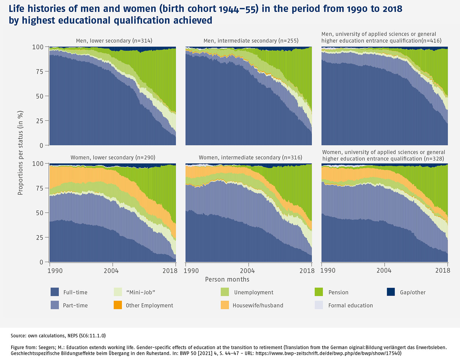 This point is picked up below, where the focus is on life histories of men and women depending on educational qualification. The object of investigation is the extent to which life phases of men and women differ shortly before retirement and after the point where retirement commences, the aim being to explore inequality effects over the course of life in connection with educational level.