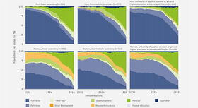 The analysis provides evidence of familiar patterns of gender-specific employment histories. Men predominantly work full-time, whereas women tend to be employed on a part-time basis and frequently with interruptions. Nevertheless, virtually no differences in proportions of phases of employment are revealed in the female group between women with average and with high levels of education. This indicates that highly educated women in particular have not (yet) been able to realise the full extent of the employment opportunities associated with their educational qualification. Women with a lower level of educational qualification are also more likely to be in “housewife phases”. Because these women have entirely withdrawn from the labour market, they are dependent on the income/assets of their partner and also rarely return to employment. On the other hand, traditional gender roles weaken in line with increasing educational qualification. The assumption may therefore be made that more highly educated women have better employment opportunities, that they are able to realise these over the course of life and that positive cumulative educational effects are reinforced in the later phases of life. This may, for example, be reflected in better payment, higher income in old age, chances of professional advancement and also a more egalitarian division of labour within a partnership.