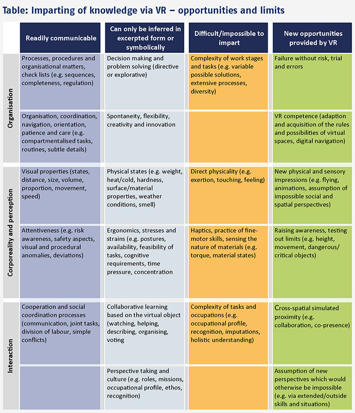 Because of their own inherent logic, VR environments are not able fully to replace learning processes based on a real object or direct social interaction. The necessary abstraction involved when stepping from the analogue into the virtual world is associated with the risk of the objectification of work, work activity and knowledge. It becomes apparent that professional knowledge and know-how are very important both for performance in the VR and for transfer back into analogue practice of what has been learned.