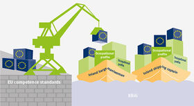 When developing the contents for the first two years of training, the social partners, the Federal Government and the federal states agreed that the EU competence standards should be taken into account and that contents at the operational level should be designed to be as identical as possible. The Vocational Training Act (BBiG) sets out the applicable standards for the structuring of training occupations in the dual system. Criteria include the occupational profile agreed during the application discussions and the principle that skills, knowledge and proficiency should be competence oriented. One initial challenge was to link this with the firm requirements stipulated in the EU Directives. In order to resolve this matter, the company experts began by formulating the training contents to be imparted separately from the EU competence standards. The competence standards were then added in (cf. Figure). A correlation list was drawn up in order to match the input and to ensure and demonstrate that the relevant contents of the draft ordinances took full account of the EU Directives.