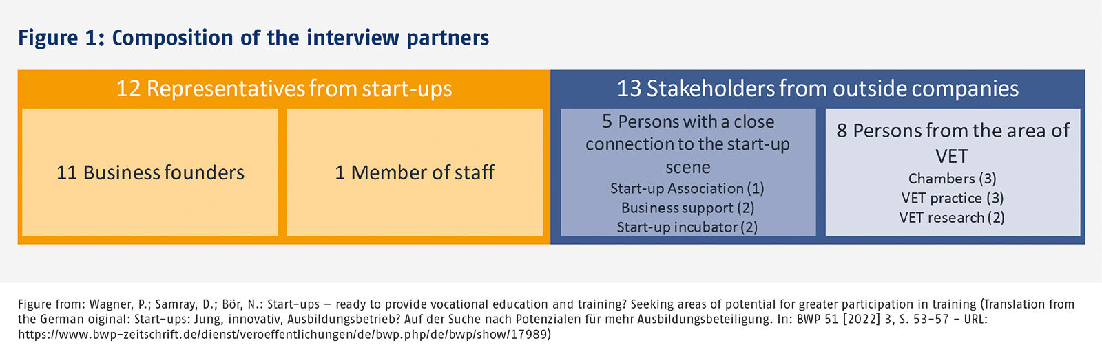 A quantitative online survey and qualitative interviews were conducted in order to investigate reasons why start-ups largely refrain from offering VET (cf. Wagner/Samray/Bör 2022). The online survey was carried out between March and July 2021. 11,422 companies were invited to take part after a machine-based and qualitative analytical procedure had been used to identify which firms with a trade registry entry could be characterised as start-ups. The survey generated 765 participations and was based on a questionnaire, the design of which was informed by specialist literature and information gleaned from the conducted interviews. Data evaluations were weighted by company age, location and sector in order to ensure approximate representativeness of results. The 25 semi-structured interviews were completed both before and after the online survey (up until and including February 2022). Theoretical prior considerations as well as results from the survey were addressed in the interviews. The interviewees comprised twelve representatives from start-ups, 13 stakeholders from outside companies including five persons with a close connection to the start-up scene and eight persons from the field of VET (cf. Figure 1).