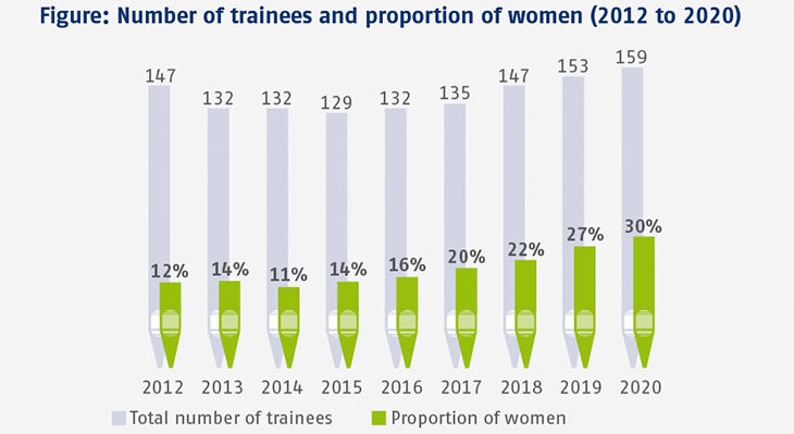 There was very little change in the number of trainee organ builders during the period from 2012 (147) to 2020 (159). This is, however, a training occupation enjoying increasingly popularity amongst young women. The proportion of female trainees rose from only 12 percent in 2012 to 30 percent in 2020 (see Figure).
