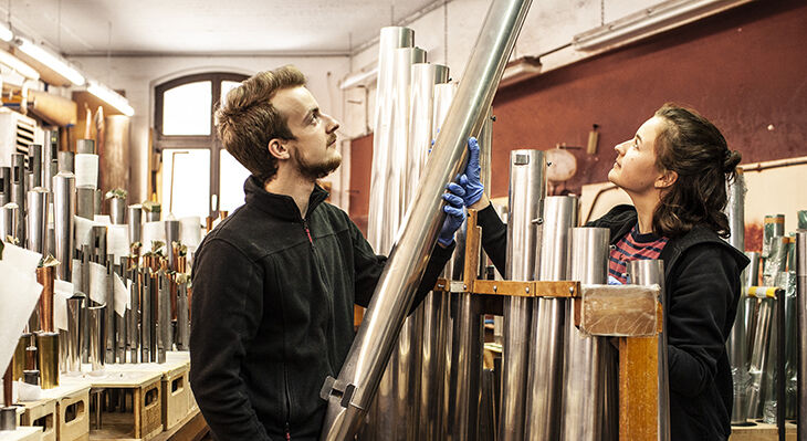 There is international demand for the manifold knowledge and skills of organ builders. German organs are spread all over the world, and site visits need to be paid for repairs or maintenance works. For this reason, organ builders are used to frequent changes of location. Even whilst still training, they often travel for several days to places where new organs are being assembled. Intercultural skills and knowledge of foreign languages are therefore important in in this occupation. When organs are constructed abroad, organ builders will recruit local staff to the team who will subsequently also be responsible for the future maintenance and care of the instrument.