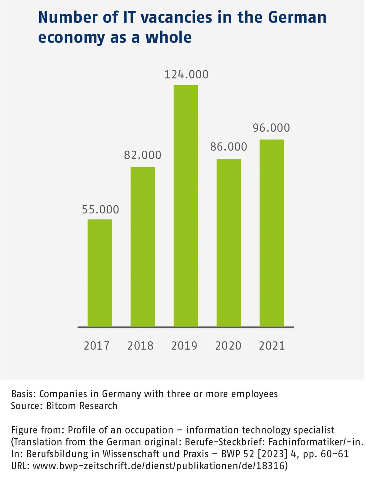 IT is deployed in almost all areas, and skilled workers are in high demand. The number of vacancies for IT specialists is at a high level across sectors (cf. Figure 2). For this reason, many companies are searching for young people interested in entering IT training. After they have completed initial VET, numerous career pathways and opportunities for further professional development are open to qualified IT workers. All IT occupations enjoy access to the nationally standardised IT continuing training system. There are also other uniform qualifications governed by federal law (including master craftsperson communication technicians, also known as Bachelor Professional in Information Technology) and qualifications at chamber level (such as certified information technologist). The growing number of higher education programmes which recognise qualifications acquired by vocational means is further enhancing the attractiveness of initial and continuing VET in information technology (e.g. Open IT – offene-hochschule.org).