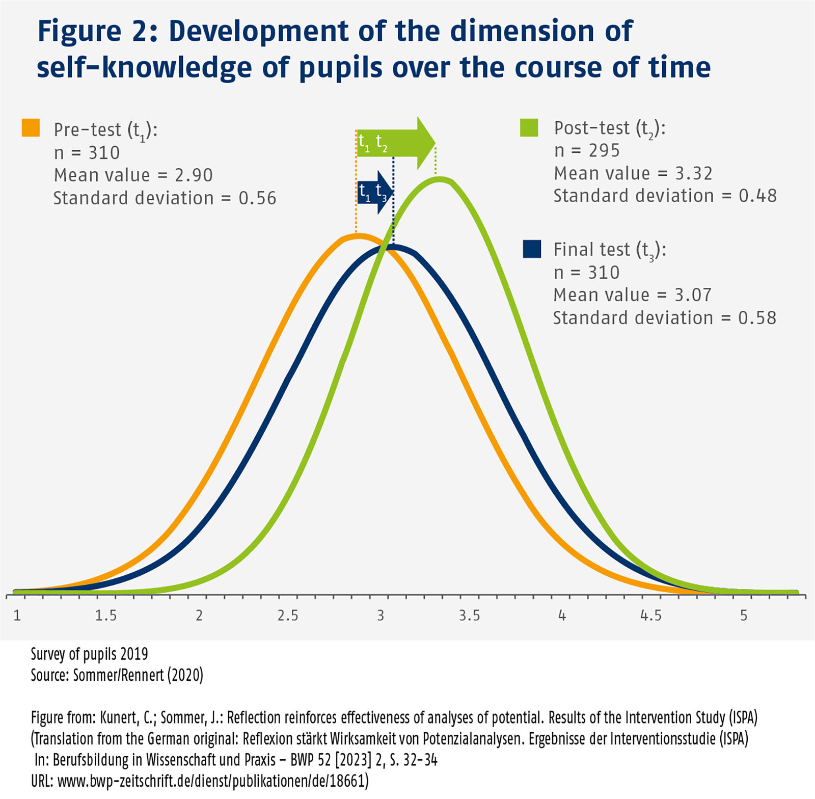 A pattern is revealed across the eight aspects of self-reflection which formed the object of investigation. “In the case of the action-oriented analysis of potential, the intended developments were below average. They tended to be strongest in the instance of the longer reflective discussion without an analysis of potential” (Sommer/Rennert 2020, p. 40). It must then be concluded that the form in which the action-oriented analysis of potential was investigated is not the best possible option for fostering motivation and self-reflection. It should be noted here that the action-oriented analysis of potential differs from other forms of intervention both with regard to the type of tasks and in respect of a lower scope of phases of reflection and of occupational references important to effectiveness. Nevertheless, it may be noted that self-reflection developed more positively than in the control group. It also proved possible to ascertain gender-specific effects. The action-oriented analysis of potential showed a significantly stronger change amongst male pupils in the dimensions investigated than amongst female pupils.