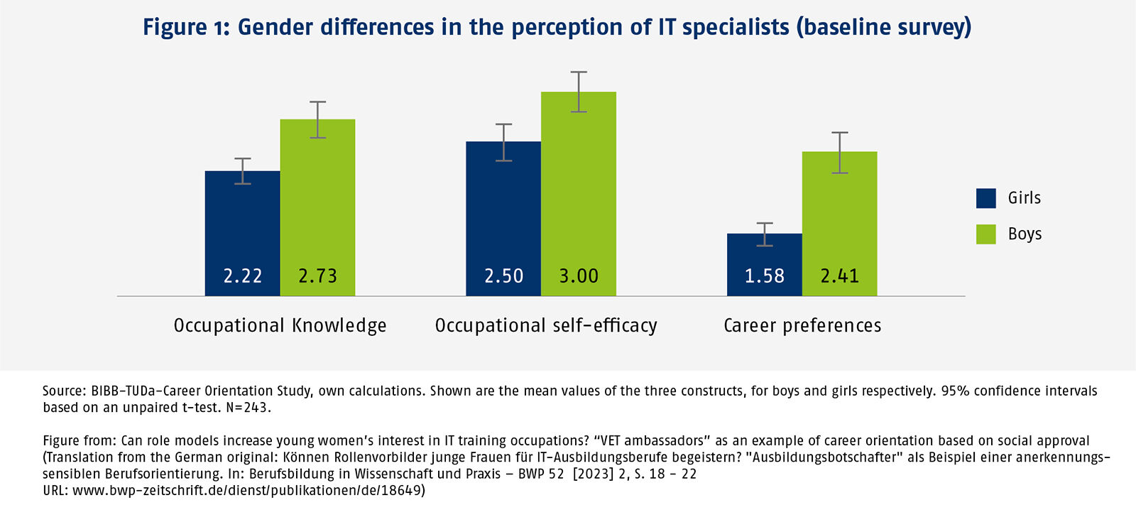 In view of the shortage of skilled workers and a pronounced underrepresentation of women in IT professions in Germany, this study asks whether vocational role models can attract more young people, especially more young women, to IT professions. This study uses the example of “VET ambassadors” in Germany – a novel career orientation approach based on social identification and social approval – to study the impact of vocational role models on students’ career preferences. Initial results from the BIBB-TUDa-Career Orientation Study suggest that role models may reduce gender differences in students’ occupational knowledge, self-efficacy and career preferences for IT professions.