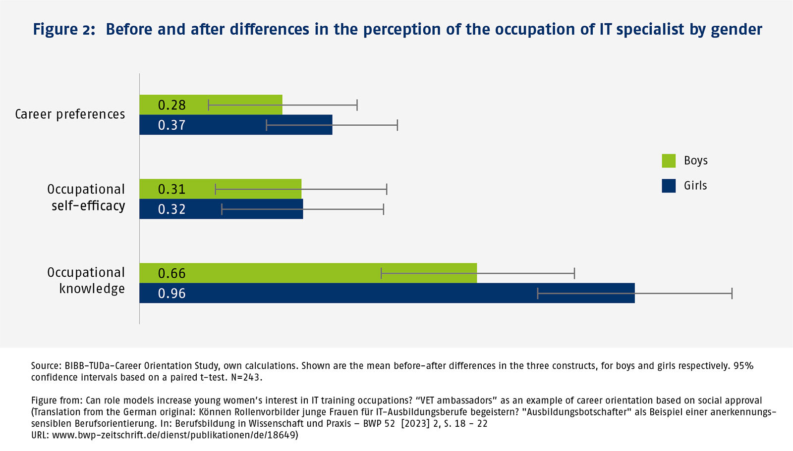 The results of the BIBB/TUDa Career Orientation Study indicate, first, that adolescents hold gender-specific perceptions of IT professions and, second, that vocational role models may break down these gendered perceptions. Girls who attended visits of “VET ambassadors” in IT professions increased their occupational knowledge and career preferences to a larger extent than boys. Vocational role models, who communicate with young people at eye level, could hence provide a promising way not only to counter the shortage of skilled workers, but also to broaden young peoples’ perception of professions. Ultimately, a school-based career guidance programme based on role modelling could increase especially young women’s interest in male-dominated professions.