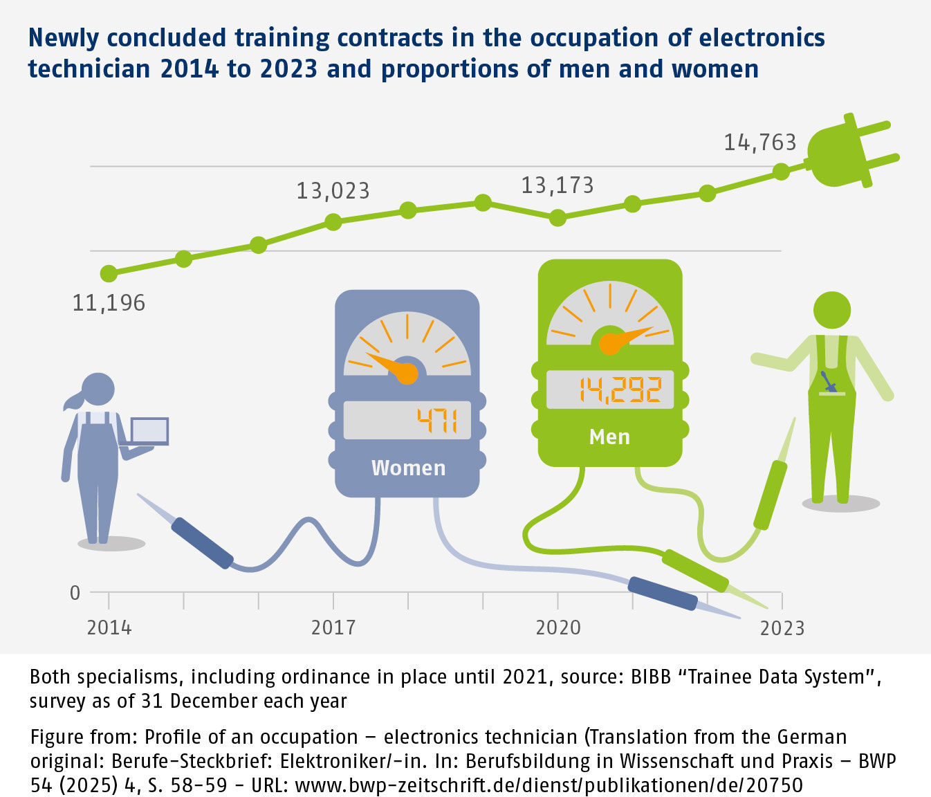 A total of 14,763 new training contracts were concluded in 2023. This makes electronics technician the ninth most popular training occupation in the ranking list of newly concluded contracts. The proportion of women (471 newly concluded contracts, 3.2 percent) remains very small (cf. Figure). This figure was, however, even lower ten years ago. The proportion of women entering the occupation in 2014 was two percent (219 of a total of 11,196 newly concluded training contracts).
