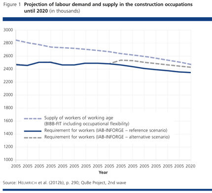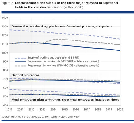 Despite the required increased demand, there will, in purely arithmetical terms, be no nationwide shortages of qualified skilled workers in the construction sector by 2020.Only individual regions and occupational fields may experience problems in filling positions before this time. Notwithstanding this, it is foreseeable that this shortage will significantly increase nationally after 2020 if the energy-related restructuring activities continue unabated.Because the rates of employment of domestic workers with vocational qualifications can only be increased by a limited extent (cf. HELMRICH et al.2012b), migration of foreign skilled workers will grow in significance over the coming years. For this reason, companies should make greater use of the possibilities offered by the Recognition Act for the recognition of qualifications acquired abroad.The high proportion of workers from the construction occupations who change occupations also shows that the building sector is obviously not sufficiently attractive for skilled workers. For this reason, just under 40 measures and campaigns have been proposed within the scope of the Build Up Skills Initiative that are aimed at closing the quantitative and qualitative gaps in securing and training skilled workers in the construction sector. Some examples of these are as follows (cf. the National Training Road Map 2013, pp. 20-51 for more details).