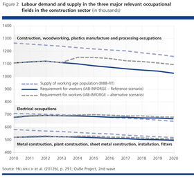 Figure 2 depicts occupational fields which are relevant to occupations in construction and the finishing trades. Whereas the purely arithmetical projection of approximately 74,000 persons of working age in the occupational field of "construction occupations, wood and plastics manufacture and processing" is likely to represent an oversupply of potential workers in the year 2020, the "electrical occupations" will experience shortages from 2014 even if the alternative scenario is not taken into account.Although a slight oversupply can still be observed in the occupational field of "metal construction, plant construction, sheet metal construction, installation, fitters", it will significantly decrease towards the end of the projection period once the energy policy alternative scenario is taken into account, meaning that it will become increasingly difficult to cover the expected demand for workers.