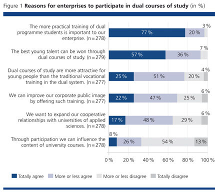But for what reasons do enterprises engage in dual courses of study? Almost all respondents (97%) felt that the practical training was important for their enterprises (response categories: totally agree, more or less agree). 93 per cent of the enterprises indicated that the best young talent could be acquired through dual courses of study (see Fig. 1). Concomitant with this is the assertion that dual courses of study are more attractive for young people than the classical initial vocational education and training in the dual system (76%). Other reasons for participation in dual courses of study are the improvement of the company image (69%) and the expansion of the cooperative relationships with the universities of applied sciences (65%). The majority of the enterprises (67%) more or less disagreed or strongly disagreed that the possibility of influencing the curriculum was a consideration. This refutes a frequently voiced prejudice to the effect that enterprises might excessively influence the content of university courses.