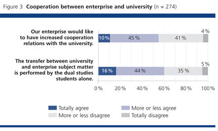 It is attractive for the enterprises to train their future managerial and technical personnel in dual courses of study. The competence advantage of dual studies graduates described above as well as the low dropout and high retention rates are further justification for calling dual courses of study a success story. But what are the reasons for this success? It would be reasonable to expect to find the recipe for success in the particular construction of such study opportunities in which two mutually beneficial learning venues dovetail. But most of the dual courses of study are far from claiming to comprise a whole in terms of content or curriculum. Often there are clearly delimited responsibilities: The university is responsible for imparting academic knowledge, while the enterprises are responsible for imparting vocational and operational competencies and skills (Kupfer et al. 2012, p. 17). Thus in the present survey 91 per cent of the enterprises agreed with the statement that the enterprises were solely responsible for the vocational training or the practical vocational activity of the students (response categories: totally agree; more or less agree). The inverse statement that the higher education establishments were solely responsible for the academic content was confirmed by 79 per cent of the companies polled. Both learning venues operate largely autonomously and have little contact and interchange except on organizational questions. However, the survey also shows that the enterprises wish to have greater cooperation with the higher education establishments. 55 per cent of the companies confirmed this statement (see Fig. 3). Mutual understanding between the two learning venues could be promoted and the quality of teaching and practice could be enhanced through more intensive cooperation, including cooperation in terms of content.
