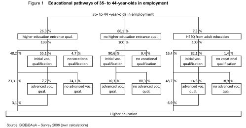 The analysis shows that initial vocational qualifications hold considerable appeal in comparison to university degrees, even for people with an HEEQ, and are quite frequently undertaken in addition. However, it also seems clear that many of them leave the intermediate qualification tier. The same is apparent for those who have acquired a second chance HEEQ, and in these cases the phenomenon would add to the bottleneck at skilled-worker level. When shaping transitions in the education system, politics and industry should focus greater attention on the training of skilled workers rather than almost exclusively on increasing graduate ratios.