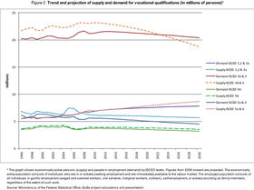On analysis of the supply and demand of occupational qualifications, the trends from 1996 to 2008 show that demand on all tiers of qualification is more than met (cf. Fig. 2). In fact, when it comes to vocational qualifications (ISCED 3b, 4), supply considerably exceeds demand. Both demand and supply of qualifications at level 5b (master craftsman, supervisor, technical engineer) are roughly static. Supply and demand are plotted very close together although demand is fractionally below supply.