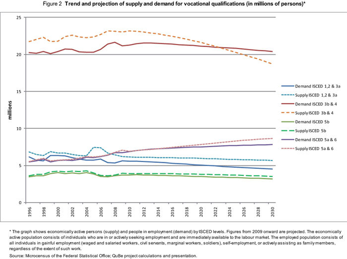 Nor is any qualification gap found as yet in the academic sector (ISCED 5a & 6). It is evident that in these two sectors, vocational education and academic education, supply and demand rise steadily over time, albeit with minor dips. In contrast, both demand and supply of individuals without a vocational qualification (ISCED levels 1-3a) are declining, so that people in this group have the poorest employment prospects (cf. BRAUN et al. 2012).