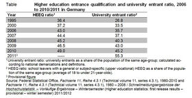 Figure 1 shows individuals with a higher education entrance qualification (HEEQ), individuals with a second-chance HEEQ, and individuals with no HEEQ. For the latter, there is a "third education pathway" which provides mature learners with certain opportunities to commence a university degree, but it has long been the case that the numbers embarking on degrees via this route are very low as a percentage of the total student population. Since the year 2009, however, access to academic education has been widened to include vocationally qualified individuals without an HEEQ. For this reason a growing increase in take-up can be expected (cf. ULBRICHT 2012).