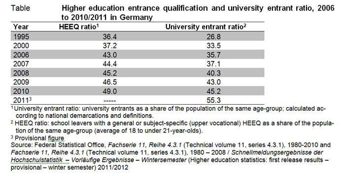 For those who subscribe to the OECD's analysis, growth in higher education qualifications is proceeding too slowly in Germany compared with other countries. Although Germany's proportion of university graduates has more than doubled from 1995- to 2010 (from 14% to 29%), it remains below the OECD average (39%) and is therefore deemed not to be keeping pace with the demand for highly qualified individuals. In contrast, stronger growth has been recorded in other OECD countries (e.g. Slovakia 15% to 61%; Portugal 15% to 40%, cf. OECD 2011).