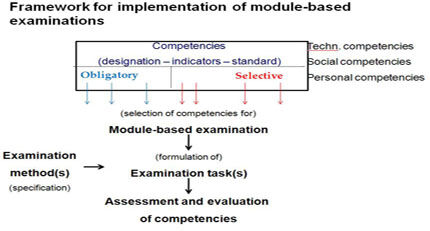 Competencies are specified for each of the defined units and modules. For each module, a limited number of technical, social and personal competencies are outlined, which are to be developed in the course of IVET and assessed by means of a module-based examination. The assessment of competencies may take place on a particular day, or at different times over the course of the module. Only in exceptional cases and for very good reasons should examinations be split into more than two parts. The diagram (p. 58) gives an overview of the elements of the examination framework.