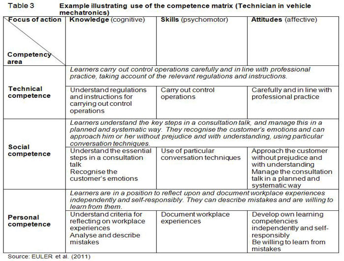 The mapping of competencies in the curricula is carried out on the basis of a competence matrix derived from the one developed by EULER/HAHN (2007). It uses the three dimensions of technical, social and personal competencies, each of which is further differentiated into the dimensions of knowledge, skills and attitudes. By way of an example, application of the matrix can be illustrated with reference to an IVET programme in vehicle mechatronics (cf. Table 3).