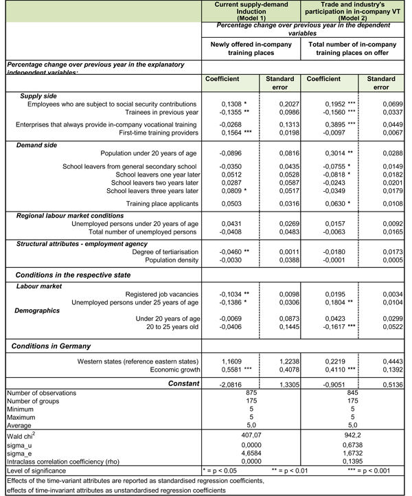 The level of trade and industry's overall participation in the provision of in-company vocational training (see Model 2 in table), measured in terms of the changes in the total supply of in-company training places in the employment agency districts, is influenced 0 as in the first analysis 0 primarily by supply-side factors, with the difference that here, first and foremost, growth in the number of enterprises which always provide in-company vocational training is more important for the regional training place market. Enterprises that begin providing in-company vocational training for the first time do not play a role here. The demand side however is certainly important as well because demographic-related, school leaver and training place applicant trends can also be shown to have an influence.