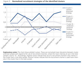 A possible means of identifying such recruitment strategies consists in the use of cluster analysis techniques (see "Cluster anayses"). Using this method, four clusters could be identified among the companies surveyed, each of which is characterised by a specific approach to finding applicants.