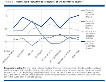 The first cluster encompasses almost a quarter of all companies (cf. Table 2). This group's recruitment strategy is dominated by channels which enable indirect, non-personal contact to be initiated with the potential apprentices, predominantly mediated via the Internet, the press and the employment office (cf. Figure 3). Figure 3 Normalised recruitment strategies of identified clustersWays of introducing themselves to young people as a training company - such as presentations in schools and at apprenticeship fairs - are distinctly under-represented in this group. To that extent, the Cluster I companies pursue an indirect-distanced recruitment strategy. The companies of Cluster II, which is the largest cluster by far, accounting for a good 50%, are rather defensive overall in their recruitment behaviour. With the exception of work placements (Betriebspraktikum), they make less intense use of all other recruitment channels than the "average company" (the zero line in Figure 3). At the same time, the data indicate that - unlike Cluster I - they tend to favour direct and personal communication over indirect contact. Against this background, the recruitment strategy of Cluster II can be characterised as defensive-personal. The third cluster unites one-sixth of companies. Overall, the companies in this cluster invest rather more effort in acquiring applicants than the average. Only the use of newspaper advertising is under-represented in this cluster. Its recruitment strategy can thus be characterised as moderate-proactive. Cluster IV, accounting for a good 7% of companies, is the smallest. It comprises companies which go even further than the Cluster III companies in their efforts to gain the attention of applicants. Particularly with regard to the direct approaches - presentations as part of school events, apprenticeship fairs and open days - their efforts go considerably beyond those of the other companies. Thus, these companies are pursuing a proactive-engaged recruitment strategy.