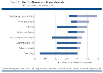 Extreme variation is found in the intensity with which companies use the individual recruitment channels (cf. Figure 2). Notifying the employment office of vacant apprenticeship places is by far the most intensely-used instrument for attracting applicants. Radical change in people's information-seeking behaviour, most notably in the younger generation, is having a noticeable effect on the placement of advertisements. The Internet has clearly outstripped the "traditional" newspaper advertisement as a means of informing young people about training opportunities. All the same, around half of companies refrain from using any form of written text - in any medium whatsoever - to reach young people. With the exception of work experience placements, strategies for meeting young people face to face are used sparingly. Over three-quarters of companies completely refrain from holding open days to showcase themselves to the target group as a training company. Less than three per cent of companies use this instrument "very intensely".