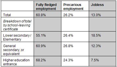 Employment is deemed to be precarious when it cannot guarantee a secure long-term livelihood. For the purposes of this study, work is defined as precarious employment if it takes the form of a fixed-term contract or if earnings are below two-thirds of the average income for the cohort of dual-system qualification holders.