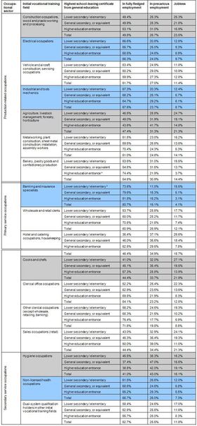 If the total percentage of those in fully fledged employment (60.8%) is considered as a threshold value, then there are indeed certain initial vocational training fields (shaded blue) in which the proportion in fully fledged employment exceeds the threshold value regardless of the type of school-leaving certificate held. The initial vocational training fields in question are 'Electrical occupations', 'Industrial and tools mechanics', 'Banking and insurance specialists' and 'Non-licensed health occupations'. In all of these initial vocational training fields, the percentages in fully fledged and precarious employment bear almost no correlation with the level of school-leaving qualification achieved. However, the percentage of jobless is always highest among those with lower secondary or elementary school-leaving certificates and always lowest among Abitur holders.