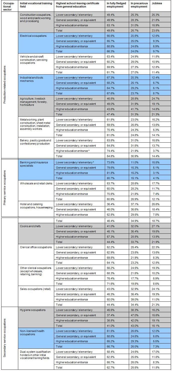 Equally, fields of training can be identified in which the percentage of jobless is always higher than the total percentage of jobless (13%) regardless of the level of school-leaving qualification achieved, and the percentage in fully fledged employment is always lower than the total percentage in fully fledged employment (60.8%). In this case, the fields of initial vocational training concerned are the 'Construction occupations, wood and plastic working and processing', 'Agriculture, livestock management, forestry and horticulture', 'Hygiene occupations' and, with reservations, also 'Cooks and chefs'. In this last initial vocational training field and in 'Sales occupations (retail)' and 'Hygiene occupations', levels of precarious employment are found to exceed 30%.