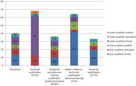 Relating mismatching to different qualification levels (highest level of vocational education attained) reveals some decisive matching patterns (cf. Figure): Firstly, workers with an apprenticeship training certificate (in the German vocational education and training (VET) sector) and university graduates perform equally well in getting a matched job. This clearly underlines the particular position of the vocational education and training system in Germany. In the case of over- or under-qualification in terms of formal credentials, workers with an apprenticeship do slightly better than graduates from tertiary-level academic institutions (19.4% as opposed to 17.4%). With regard to skills and knowledge, however, workers who have completed dual and school-based VET are more likely to be over-qualified than university graduates. Compared to these two groups, those without qualifications and workers who have undergone advanced training to obtain a master craftsman or technician qualification are significantly less likely to have a matched job. However, the completion of a master craftsman or technician qualification mostly leads to over-qualified employment only from a formal point of view, not necessarily with regard to the required skills.
