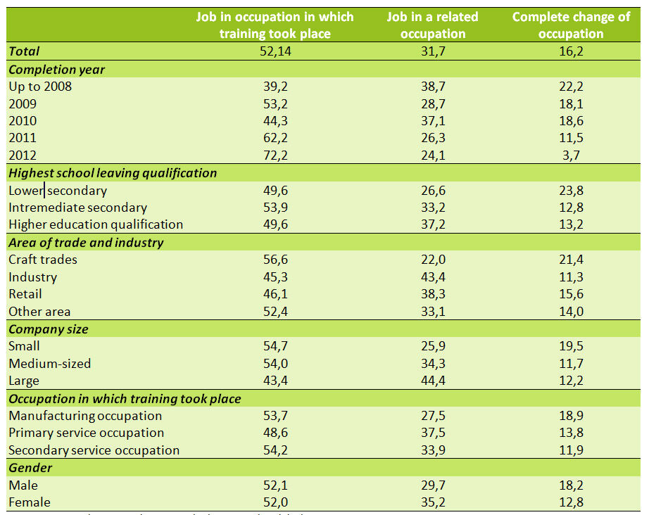 As the Table shows, complete occupational change becomes more likely as time elapses since conclusion of training. In 2012, shortly after the end of their training, only around four percent were working outside the occupation in which they had trained. This is also connected with the possibility of being offered permanent employment by the company providing training. Of those who completed training in 2011 and 2010, as many as twelve percent and 19 percent respectively were recorded as having made a complete occupational change. The highest proportions of changes of occupation (24 %) were exhibited by those with a lower secondary school leaving certificate. In the case of young people with a higher qualification, the rate of change was only 13 percent. Training in the craft trades sector is more likely to lead to a change of occupation than training in industry (21 % as opposed to 11 %). The proportion of occupational change made by workers who trained in small companies (20 %) was also relatively higher. The sort of requirements-based training that frequently takes place in the craft trades and at small companies thus influences both chances of being offered permanent employment after training and the rate of occupational change. Secondary service sector occupations are associated with high rates of employment growth and are less likely (12 %) to see occupational change than primary service sector occupations (14 %) or manufacturing occupations (19 %), a typically male domain in which employment numbers are falling.2 This also explains why in overall terms men are more likely than women to make a complete change of the occupation in which they have trained (18 % as opposed to 13 %).