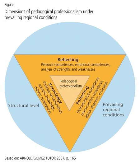 Taking the concept of reflexive pedagogical professionalisation (cf. ARNOLD/GÓMEZ TUTOR 2007, p. 164) as a basis, it was fundamental to the study that occupational competence is guided by three dimensions - knowledge, ability and reflection. Professional expertise is only created as a result of the interplay of these dimensions. This concept was expanded via integration into the prevailing regional conditions, i.e. into a joint action framework that is of significance to all four groups of educational professionals (cf. Figure).
