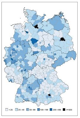Overall there is a very strong statistic connection between the adult population in a rural/urban district and the number of continuing education and training providers (with a correlation coefficient of 0.92). In North Rhine-Westphalia, the most populous federal state and a territorial state with a high population density, the majority of rural and urban districts have 50 or more continuing education and training providers. The situation in Bavaria is totally different: most districts have fewer than 25 providers in the federal state with the second-largest population. Thus at first glance, the supply situation for the Bavarian population with regard to continuing education and training opportunities appears to be below average in large areas of the state. This impression, however, is caused by the large number of small districts in Bavaria: Bavaria consists of 96 rural and urban districts, almost twice as many as in North Rhine-Westphalia (53 districts) despite its smaller population. A similar correlation between a small-area district structure and a small number of providers per district is present in Rhineland-Palatinate and Thuringia. On the other hand, districts in Northern and Eastern Germany have a larger number of providers in most cases, since these districts are larger in area and urban districts are rare.