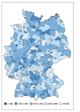 This North-South or West-South divide is put into perspective when we look at the provider density, i.e. the number of adult inhabitants per provider in a rural or urban district (cf. Fig. 2). Serious differences between the federal states as seen in Figure 1 are no longer discernible. Topping the list in terms of provider density (with less than 1,500 adult inhabitants per provider) are exclusively urban districts, frequently those of medium size, which obviously also supply the surrounding rural districts with their often very low provider density. The urban districts with the highest provider density are Ansbach (940 adult inhabitants per provider), Landau in der Pfalz and Koblenz (1,100 each). The large cities with the highest absolute number of providers, on the other hand, have a slightly lower provider density between 1,500 and 2,999 adults per provider (with the exception of Frankfurt am Main). It also becomes clear from Figure 2 that a country-wide supply of continuing education and training providers to the entire population is ensured if the urban/rural district differentiation is taken into account.