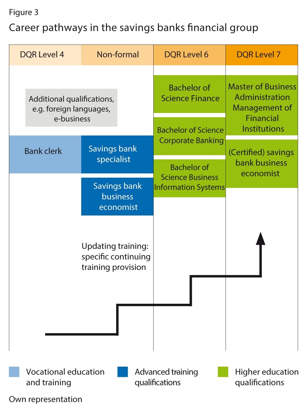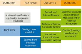 By way of contrast, savings bank business economists within the meaning of the state regulated qualification of bank business economist are found in middle management positions, whereas the former advanced training occupation of certified savings bank business economist, which provided a qualification for strategic leadership tasks, has been replaced by an accredited Masters course of study at the savings bank academy. Alignment to the reference levels of the DQR has, however, not been possible thus far due to the fact that these training courses are not formally state recognised with the exception of a small number of chamber regulations leading to the qualification of savings bank specialist pursuant to §54 BBiG. Training architectures of the bank academies are certainly based on extensive coordination processes with the regional bank institutes and a differentiated determination of requirements, and orientation towards competence models is also revealed (cf. e.g. Haase/Ringwald 2012; Schax 2008). Opportunities for credit transfer to the accredited courses of study at the academies means that there is also a certain degree of permeability within the individual pillars.