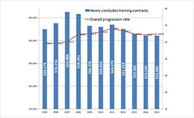 The number of newly concluded training contracts is not the only aspect which is central to educational policy evaluation. Development of the overall system of vocational training including the transitional area and the higher education sector also needs to be considered. This is something which the Integrated Training Reporting System is able to ensure.