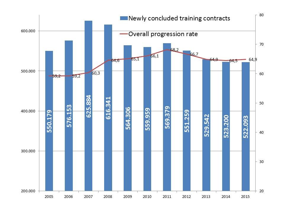 The progression rate of those interested in training states the proportion of persons interested in training institutionally recorded who progress to vocational education and training in a reporting year. This involves relating the number of newly concluded training contracts as of 30 September to the total number of persons institutionally recorded as being interested in training (804,400 in 2015). This is calculated arithmetically by adding registered training place applicants who have not progressed to VET according to the statistics of the BA to the number of newly concluded training contracts (cf. ULRICH 2012).